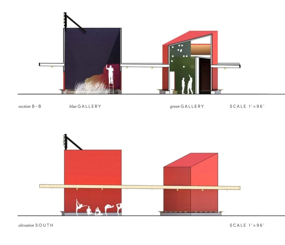 Each of the four galleries is designed with a distinct spatial quality—open to the sky, softly lit, enclosed, or artificially illuminated—supporting a range of moods and uses. The golden and green galleries bring in indirect light and house the café and restroom. The blue gallery is open-air and ideal for events, while the black gallery offers full enclosure and controlled lighting. Together, they form a flexible system that can be used individually or as a collective. The shared CLT roof structure ties them together while allowing future adaptation, and a movable curtain system provides optional privacy and further use variation.