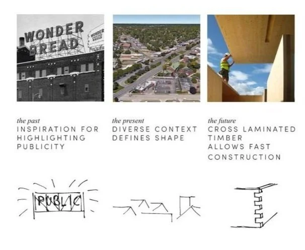The pavilion draws from Roseville’s past, present, and future. Its bold signage references the legacy of local landmarks and the tradition of making civic spaces visible and accessible. The form responds to the surrounding context—residential, commercial, and open—creating a balance between intimacy and public presence. Built in cross-laminated timber (CLT), the structure embraces modern construction methods that allow for off-site fabrication, fast assembly, and phased implementation. The result is a pavilion that feels local, functions flexibly, and is built to last.
